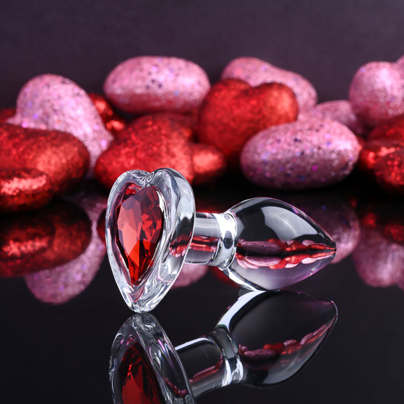 Adam & Eve RED HEART GEM GLASS PLUG SMALL - Clear Glass 7.4 cm Butt Plug with Red Heart Gem Base