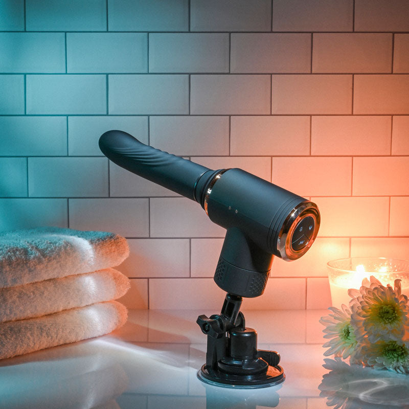 Sophisticated design meets ultimate satisfaction with this powerful machine that makes your pleasure its top priority! An adjustable suction cup mount gives you hands-free play like you’ve never experienced! Click the sleek silicone shaft into the main barrel and away you go - thrusting in 7 glorious speeds with over half an inch of delicious push. Then unleash the vibrations for 7 speeds to rock your world - and don’t forget the heating function that warms you up from the inside! An elegant 3-button control panel allows access to each separate motor with ease, giving you the ride of a lifetime! And when it’s time to clean up, the shaft packs up into the long handle – and everything comes with a neat cap for storage. Rechargeable, splashproof and easy to clean!