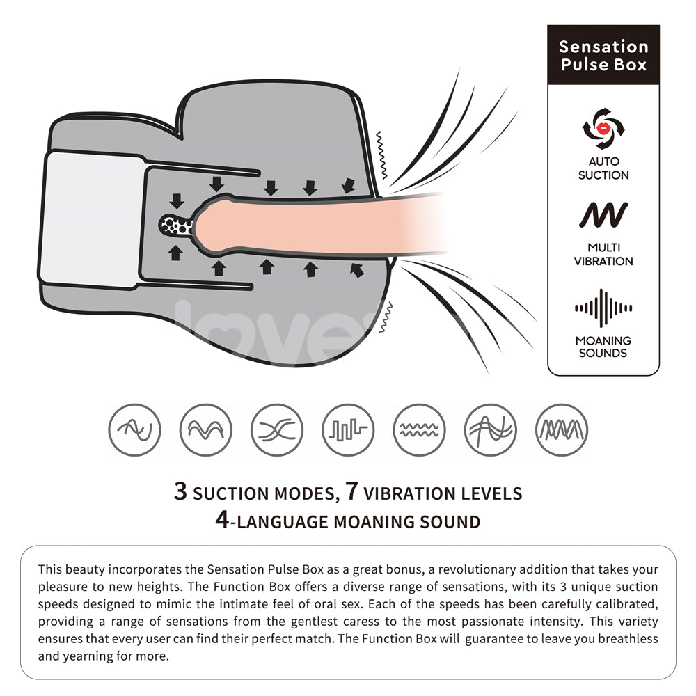 - 3 suction modes, 7 vibration levels, 4-language moaning sound.